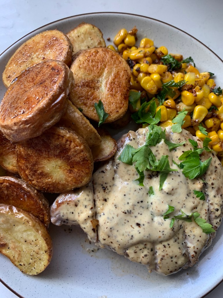 White Barbecue Southern Pork Chops with Crispy Potatoes and buttery corn π₯©π½π₯